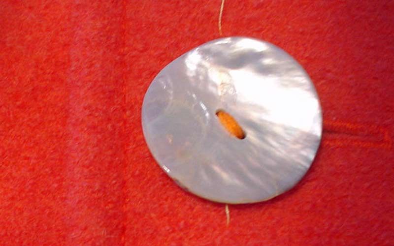 Zwischen Knopf und Stoff benötigen wir einen Abstand damit später die Kleiderseite mit dem Knopfloch unter dem Knopf genügend Platz hat. Dieser Fadensteg wird als Hals bezeichnet und seine Länge richtet sich nach der Dicke des Stoffes: Ein Mantelknopf braucht einen längeren Fadensteg als ein Blusenknopf. Als Hilfsmittel benützen wir hier zwei Zündhölzer, bei dünnen Stoffen reicht ein Zündholz oder eine Wollnadel. Nun einige Male durch den Knopf hin- und herstechen. Dabei immer die doppelte Stofflage mitfassen.