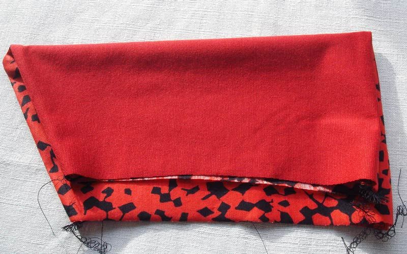Verstürzen Sie die obere und untere Kante rechts gegen rechts mit der Overlock oder mit einem dehnbaren Zickzackstich der Nähmaschine.