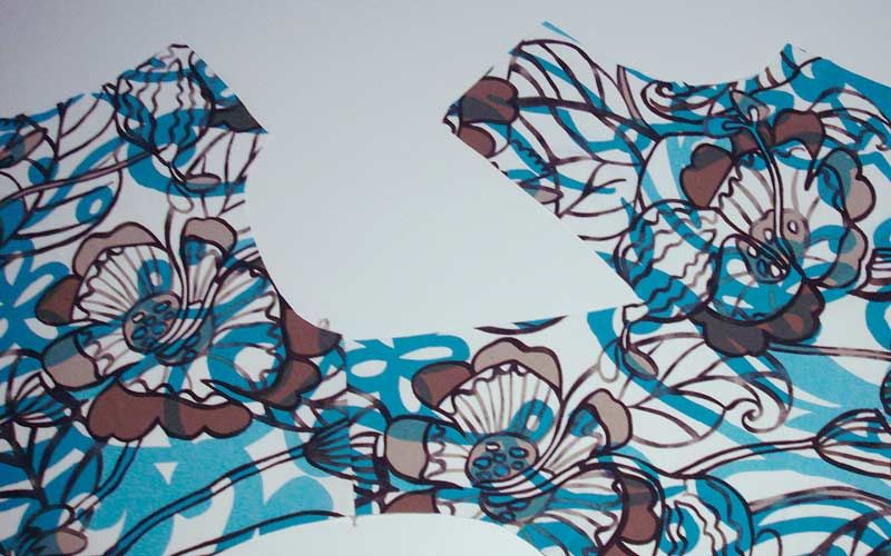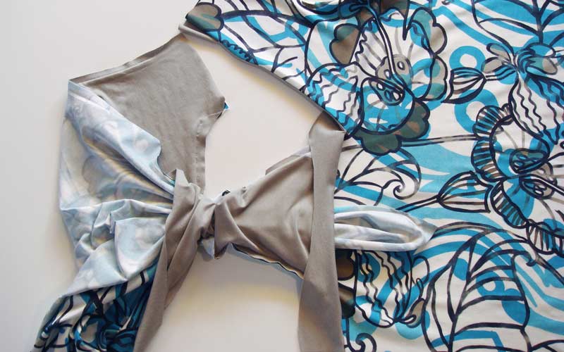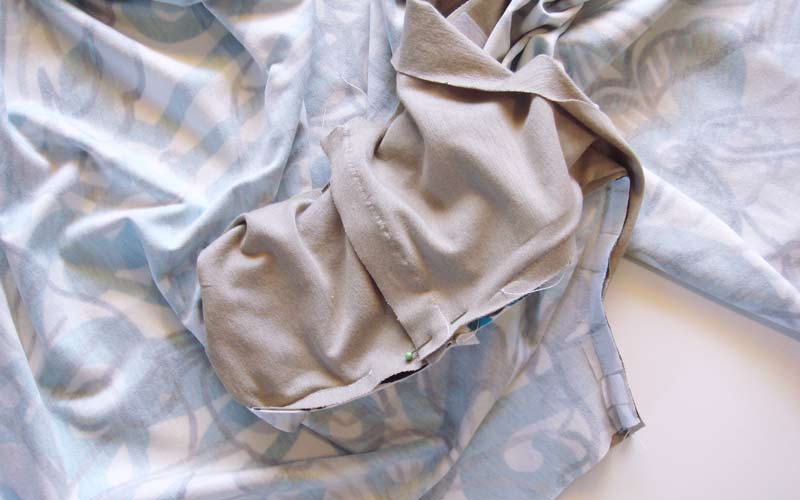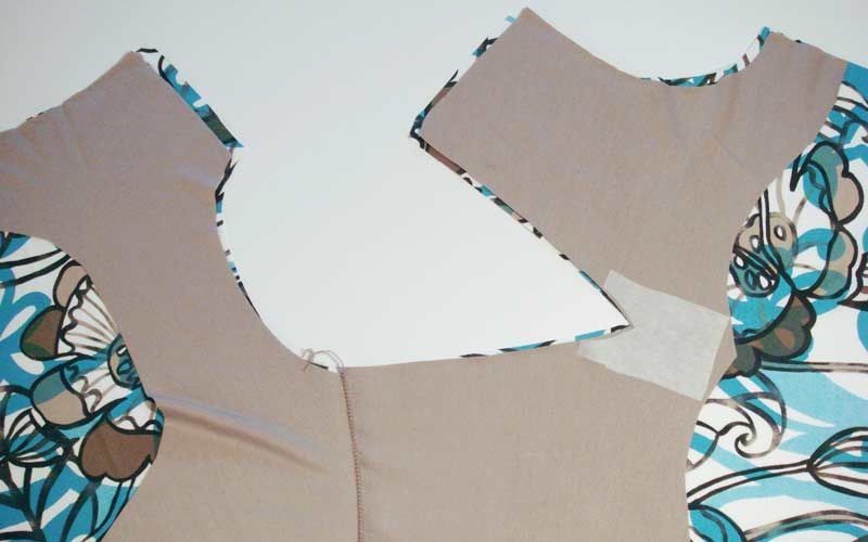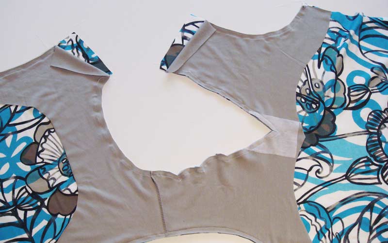 Nach dem Zuschnitt: Bekleben Sie am Shirt und am Besatz das untere Ende des V-Ausschnittes mit einer passenden Einlage, damit später beim Einschneiden keine Fallmaschen entstehen. Nähen Sie alle Nähte mit kleinen Zickzack-Stichen, damit die Nähte elastisch bleiben. Nähen Sie die rechte Schulternaht Ihres Shirts und die rechte Schulternaht des Besatzes. Achten Sie darauf, dass beim Besatz die schöne Seite des Stoffes am Innern des Körpers zu liegen kommt.