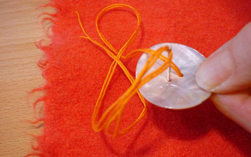 In order to create this space between button and material use two match sticks or a knitting needle and place then onto the button. Now pierce through the button several times in and out always catching the material underneath.